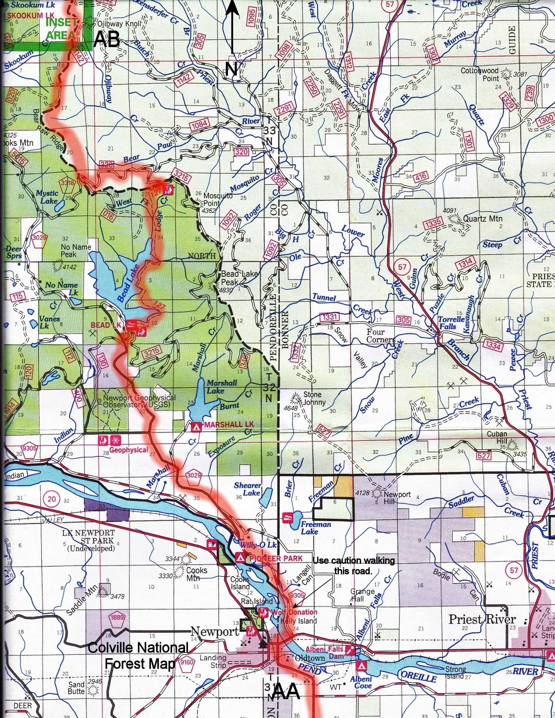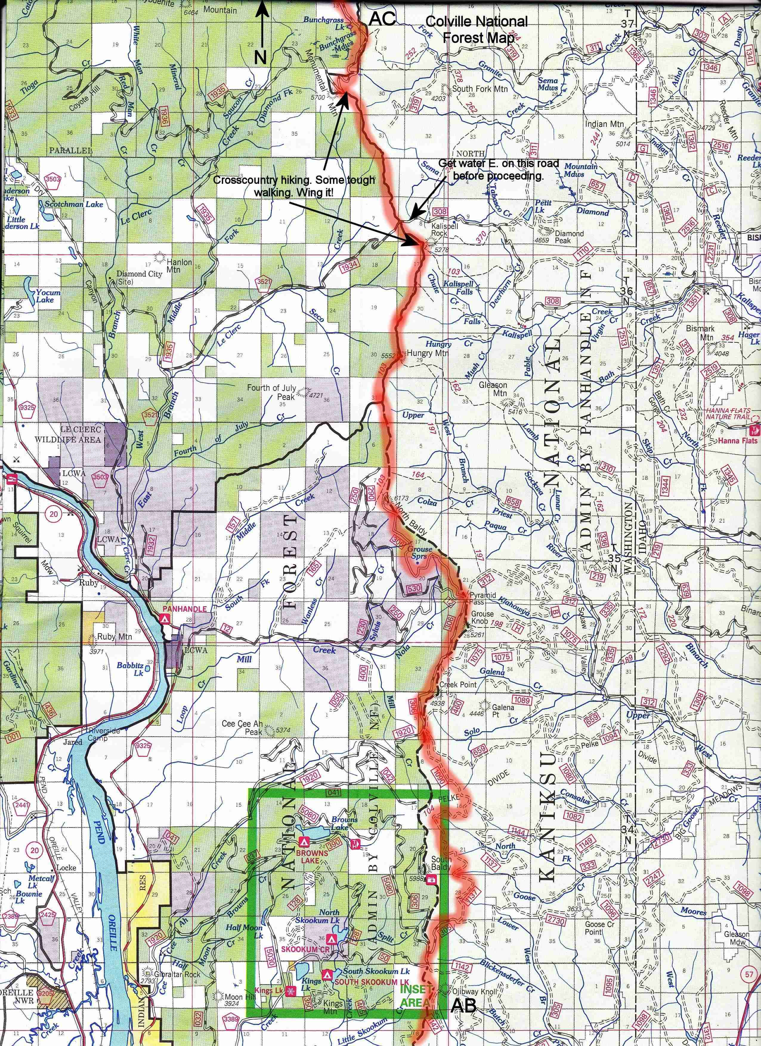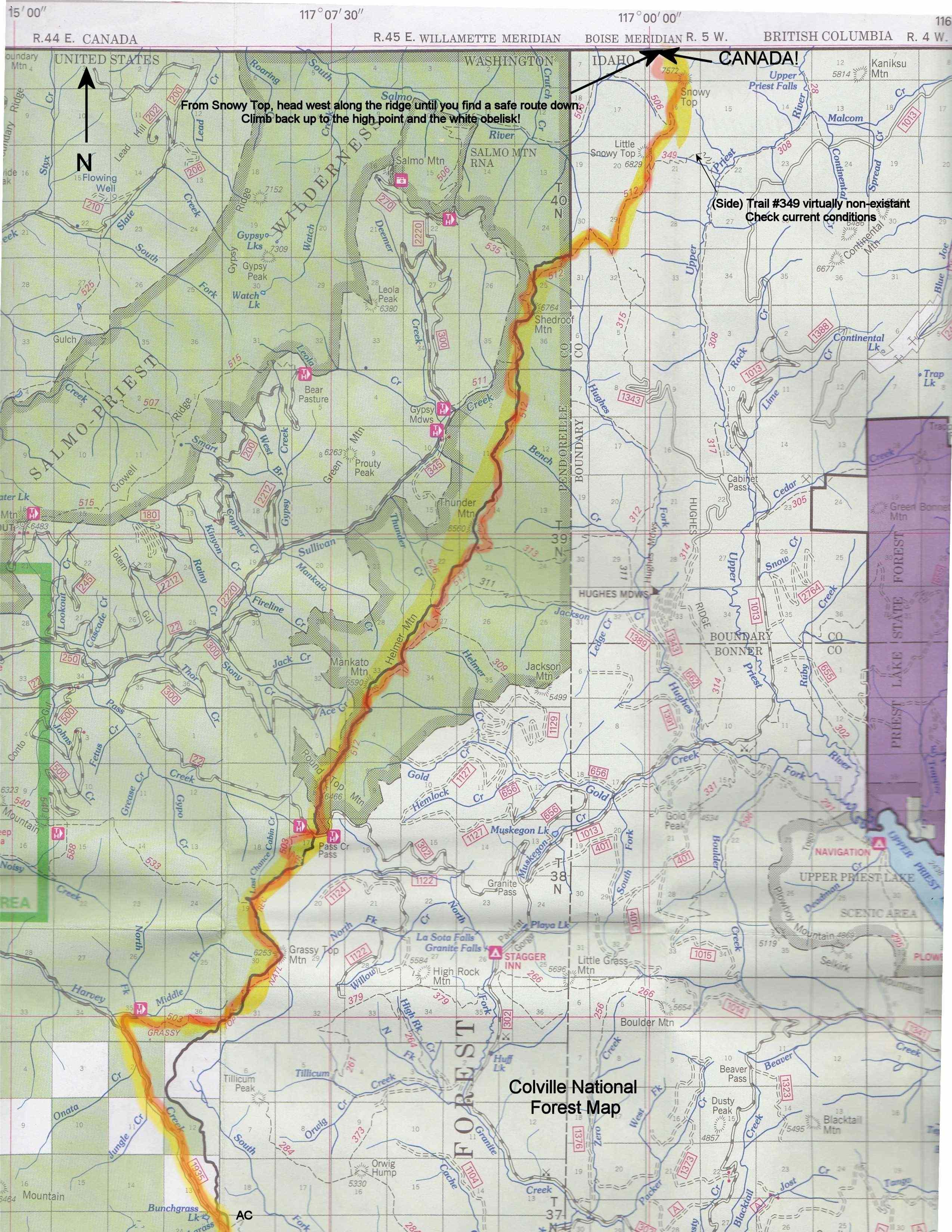 The last 25 miles or so of the route is the most scenic and wild. There are great views in good weather, and a long walk along the Grassy Top trail in the Salmo-Priest Wilderness. For someone out for a shorter hike, starting at the Harvey Creek trailhead and hiking north would be one of the nicest stretches.