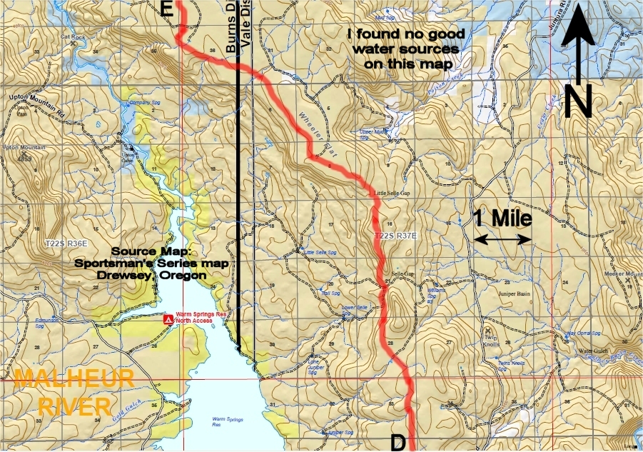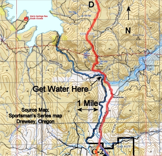 I found no drinkable water from the river to Drinkwater Pass. There are springs plotted near the route between the Juntura Road and Highway 78, but that stretch is a reroute and has not been scouted yet.