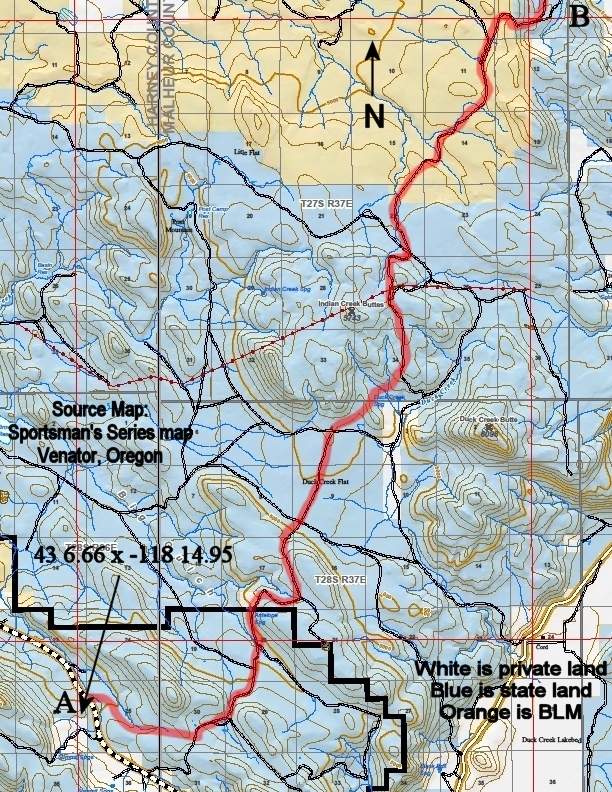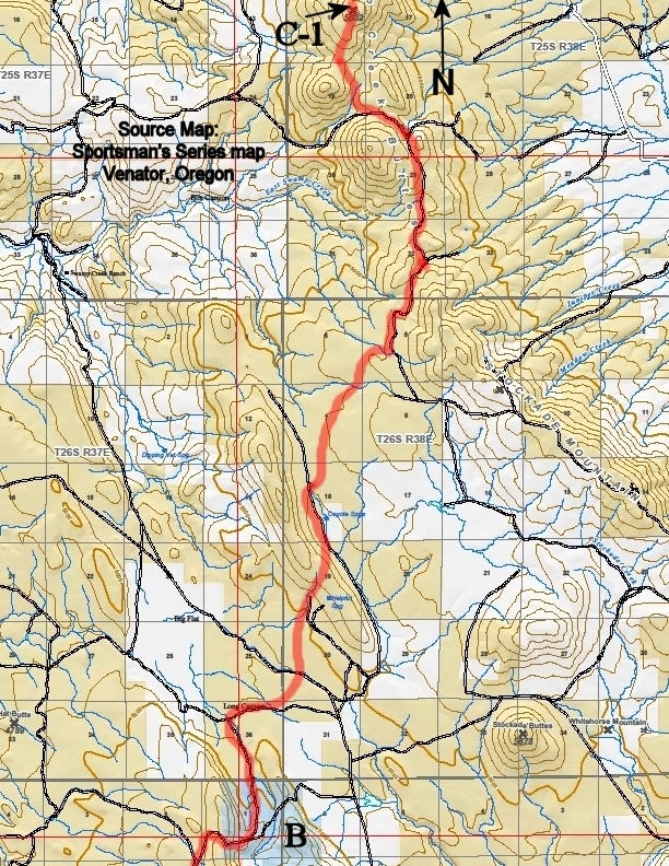 This segment leaves Highway 78 in Oregon near Summit Springs and heads cross-country across state and BLM high desert lands before joining the Juntura-Riverside Road for a few miles. After crossing the Malheur River it climbs back up to travel cross-country through high desert all the way to Drinkwater Pass.