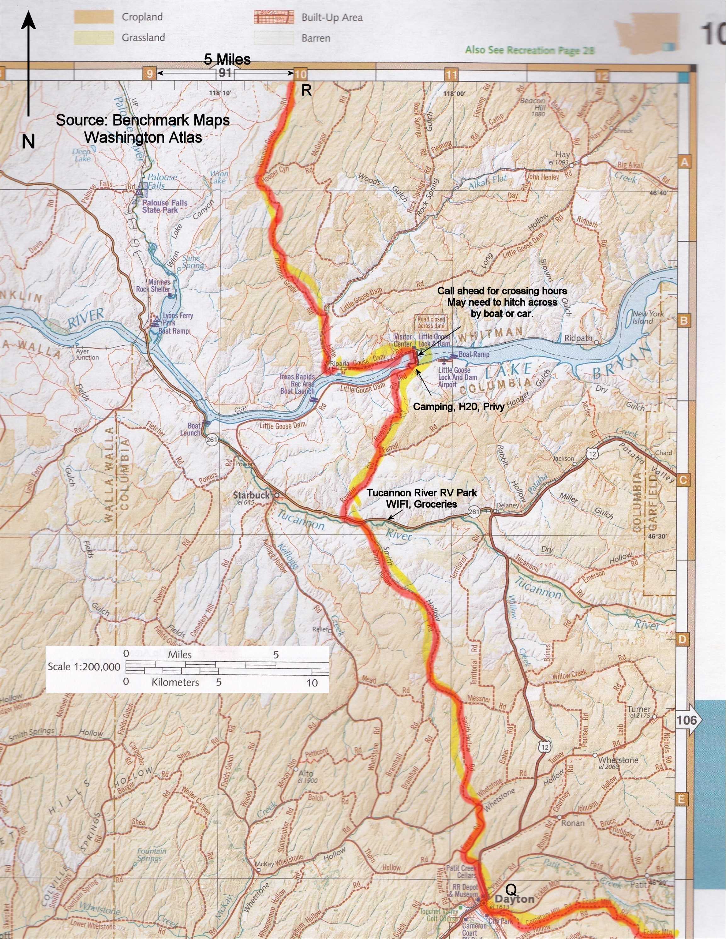 Consider camping at the RV campground or Little Goose to avoid camping on private land. You can push on to the Columbia Plateau Trail to camp the next night.